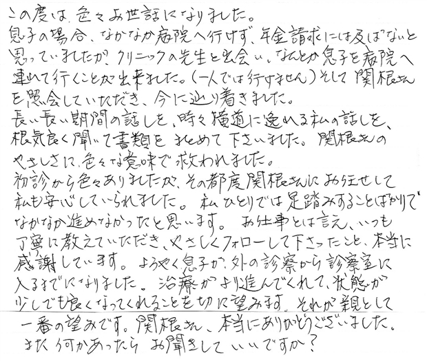 この度は、色々お世話になりました。息子の場合、なかなか病院へ行けず、年金請求には及ばないと思っていましたが、クリニックの先生と出会い、なんとか息子を病院へ連れていくことができました。(一人では行けません) そして関根さんを紹介していただき、今にたどり着きました。